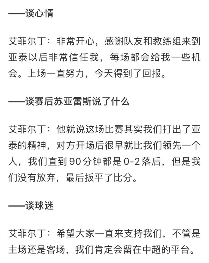 打进关键一球的艾菲尔丁的心情就是“开心”!毕竟是年轻球员嘛,情绪自然比老将要亢奋一些,艾菲尔丁表示球队肯定会努力留在中超这个平台上!
