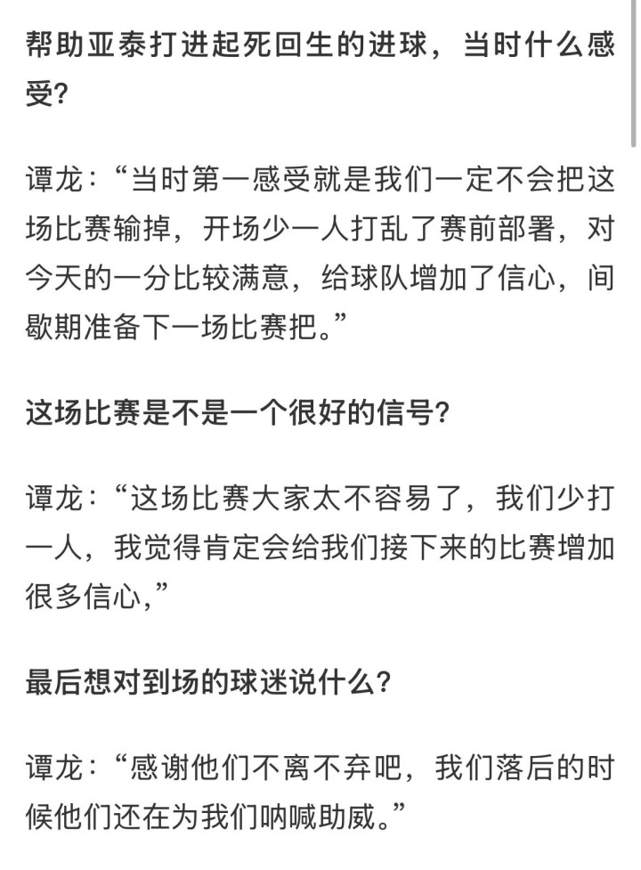 谭龙的情绪还是围绕着保级转的,他表示这场比赛能够艰难地获得一场平局,给球队增加了信心,球队还是要回去准备好下一场比赛!